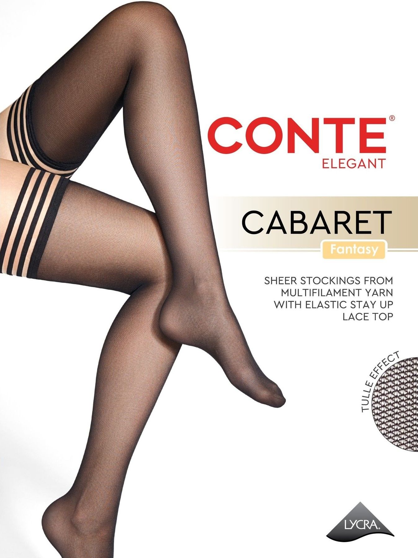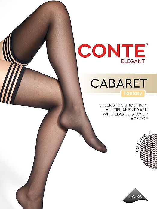 CONTE арт. 23С-150СП CABARET 30 stay-up - эластичные средней плотности (30 DEN) самодержащиеся элегантные чулки в микросетку - с эффектом тюля, серии FANTASY (фантазия). С гладкой оригинальной резинкой-каймой в котрастную полоску (с силиконом, для лучшей фиксации и удержания) и отделкой люрексом. Уже не тонкие, но еще прозрачные. Мелкоячеистая тюлевая структура фактически незаметна, но придает особый шарм, а также улучшает практичность (стойкость к образованию стрелок). Предлагаются в размере: 1/2 и 3/4.