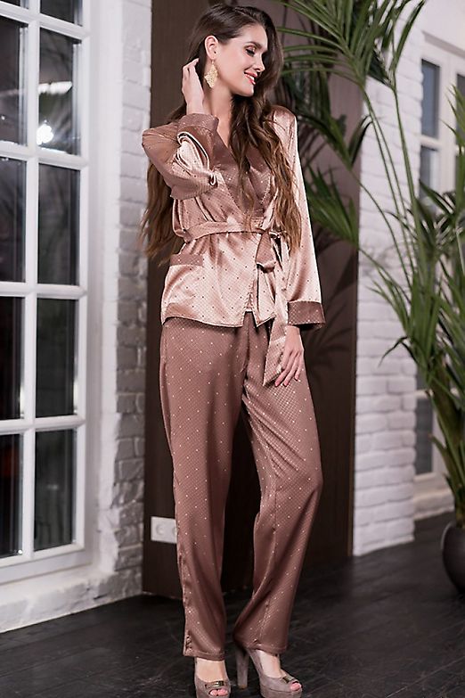На блузе накладные карманы. Брюки с небольшими разрезами по низу, по бокам карманы.
