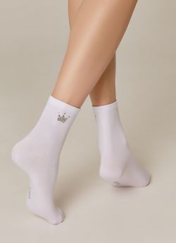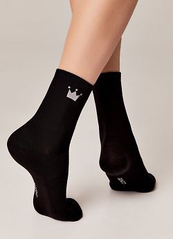 CONTE арт. 22С-40СП CLASSIC - 430 - женские носки классической длины, серии CLASSIC. С рисунком из люрекса в верхней части паголенка - "QUEEN" (в виде символа короны). Всесезонные. Изготовленные из пряжи хлопка (72%), с добавлением полиамида (26%) для лучшей практичности и эластана (2%) для лучшей сохранности формы. Традиционный материал хлопок отлично дышит, дает комфортную мягкость, способность хорошо впитывать влагу и гарантирует гигиеничное ношение.